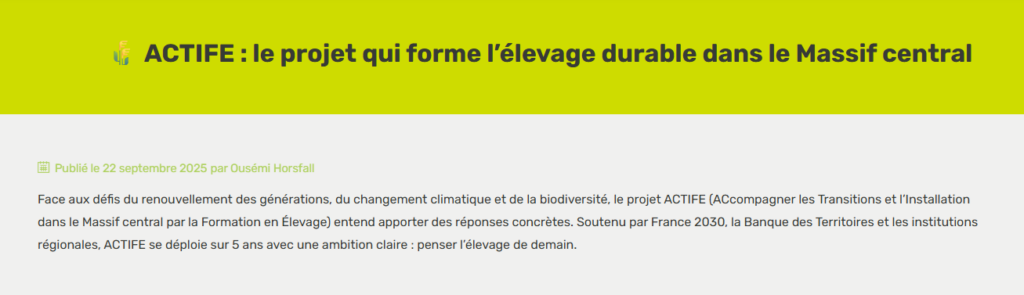 Article du Comptoir des Éleveurs, le média du Sommet de l’Élevage : https://www.comptoir-des-eleveurs.com/articles/473ece7d-b697-f011-b484-000d3a26b476/-actife-le-projet-qui-forme-l-elevage-durable-dans-le-massif-central avec le laius suivant : « Notre partenaire associé, le SOMMET DE L’ÉLEVAGE, via son média Le Comptoir des Eleveurs, valorise de nouveau le projet ACTIFE ! Un très bel article « ACTIFE : le projet qui forme l’élevage durable dans le Massif Central ». Vous retrouverez avec clarté les objectifs et les missions de notre projet ! »